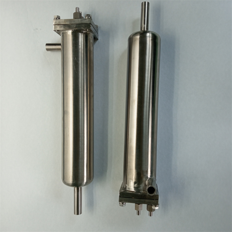 冷卻器由內(nèi)螺旋管、外螺旋管組成。共同安裝在一個筒體內(nèi)。外螺旋放在呈螺旋運行的冷卻水中進(jìn)行熱交換;內(nèi)螺旋管在呈渦流運動的冷卻水中進(jìn)行熱交換,兩種冷卻水巧妙地匹配在一只冷卻器中進(jìn)行流動。